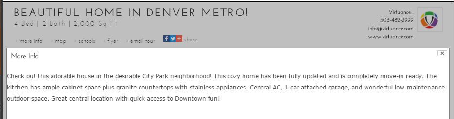 TIP: To improve Search Engine Optimization, we recommend adding key words that you want your property to be found by search engines. For example, on this property we might add 1234 Main Street Denver, CO 80222 Colorado, City Park, Susie Agent, Virtuance - etc.
